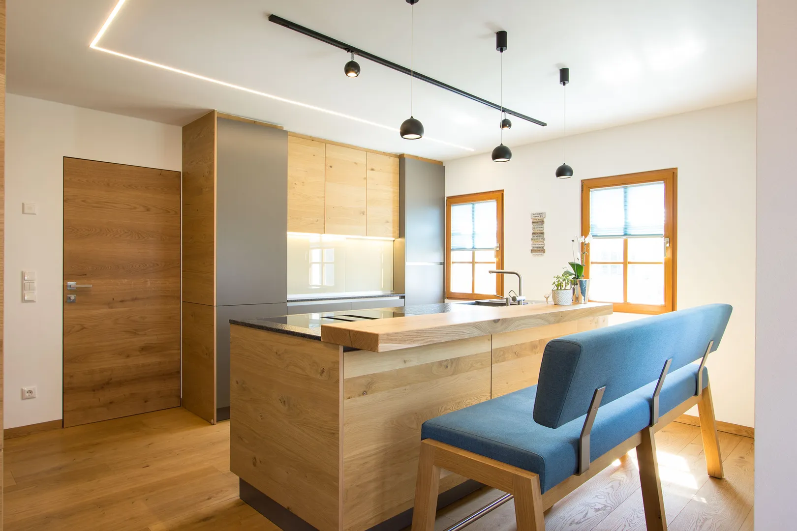 Moderne Einbauküche mit grauen Fronten, Holzdetails und Essbereich mit Holztisch und vier Stühlen