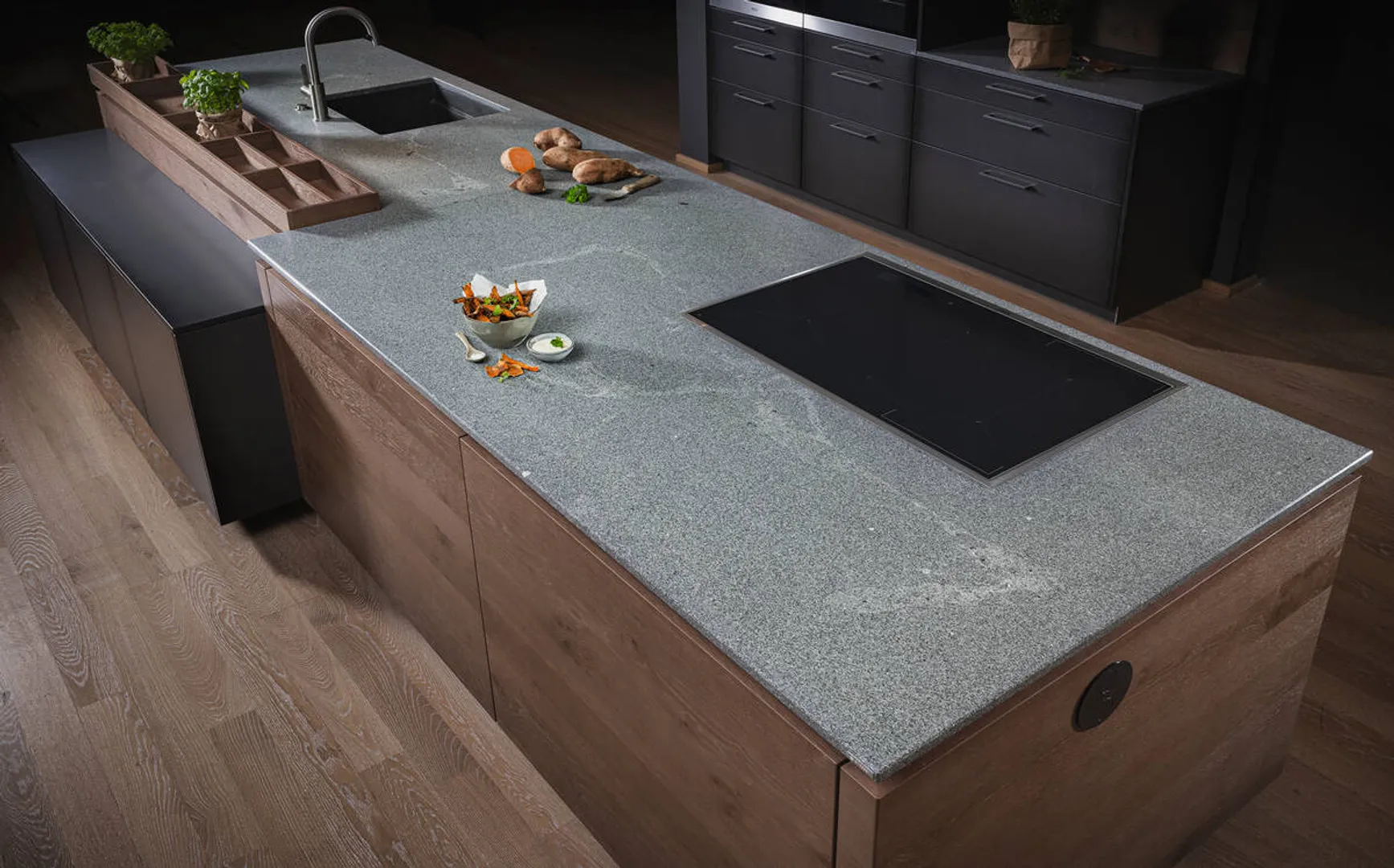 • Die verschiedensten Holzarten können in Kombination mit einer modernen Steinarbeitsplatte in Szene gesetzt werden.