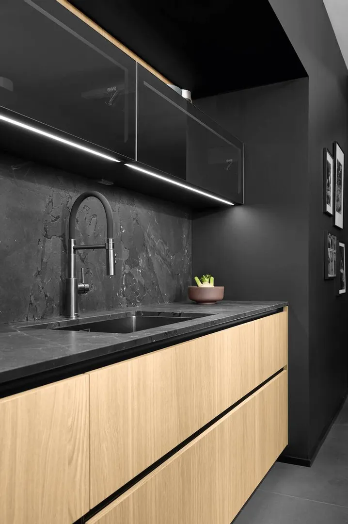Moderne grifflose Holzküche mit schwarzer Steinplatte