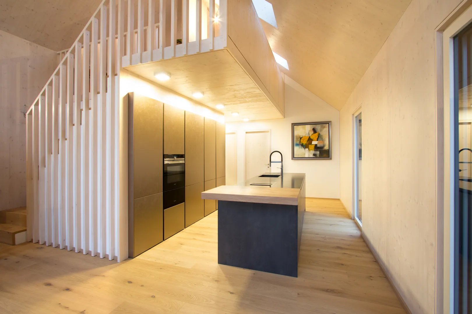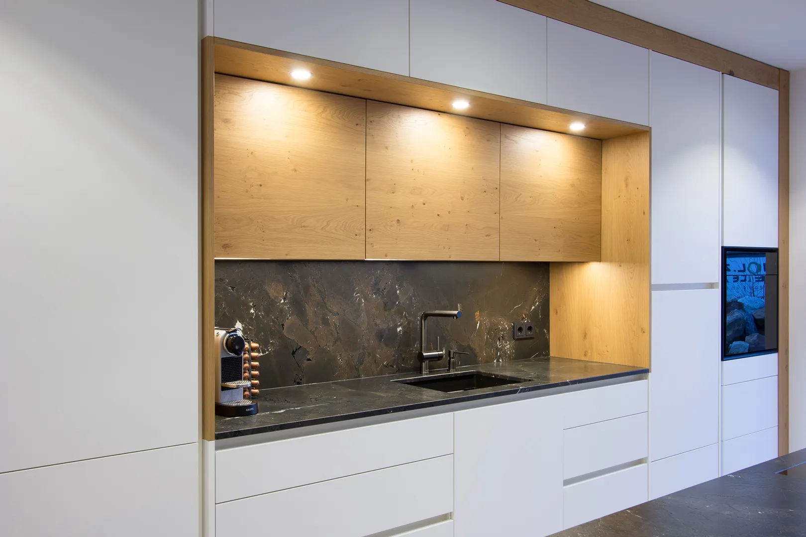 Moderne weiße Küche mit Holz