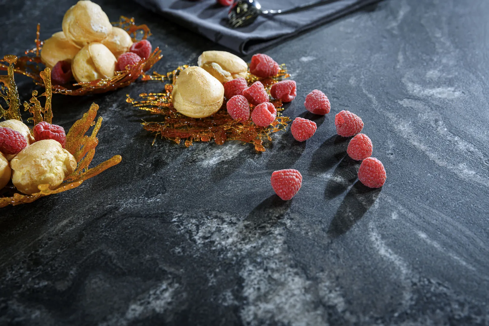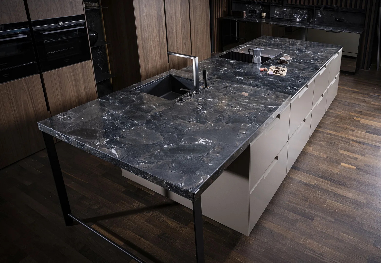 • schwarze und dunkle Steinarbeitsplatten wirken elegant und modern