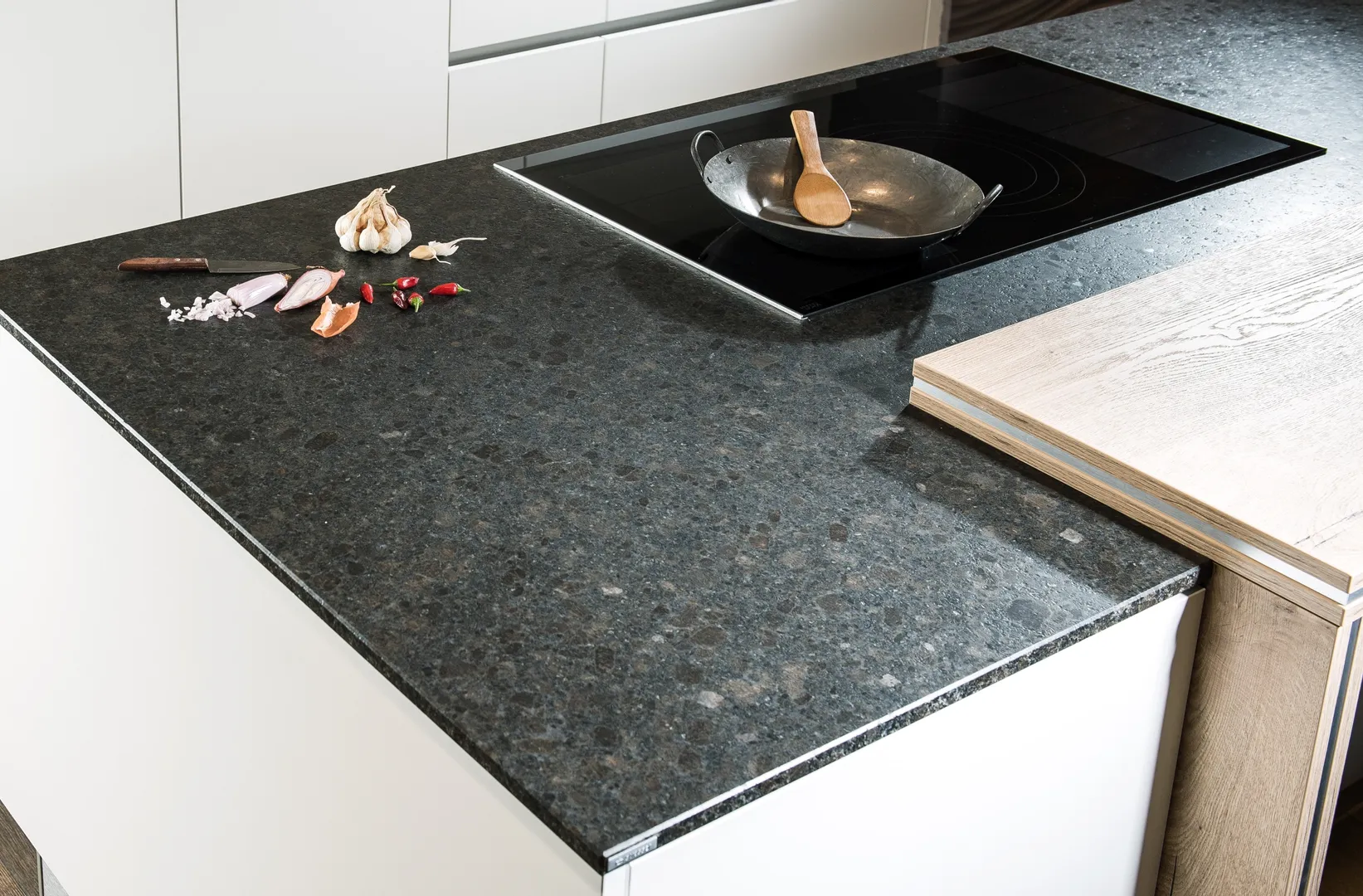• Braune Steine wirken nicht so hart wie schwarze Arbeitsplatten und sie passen sehr gut zu allen Holzarten.