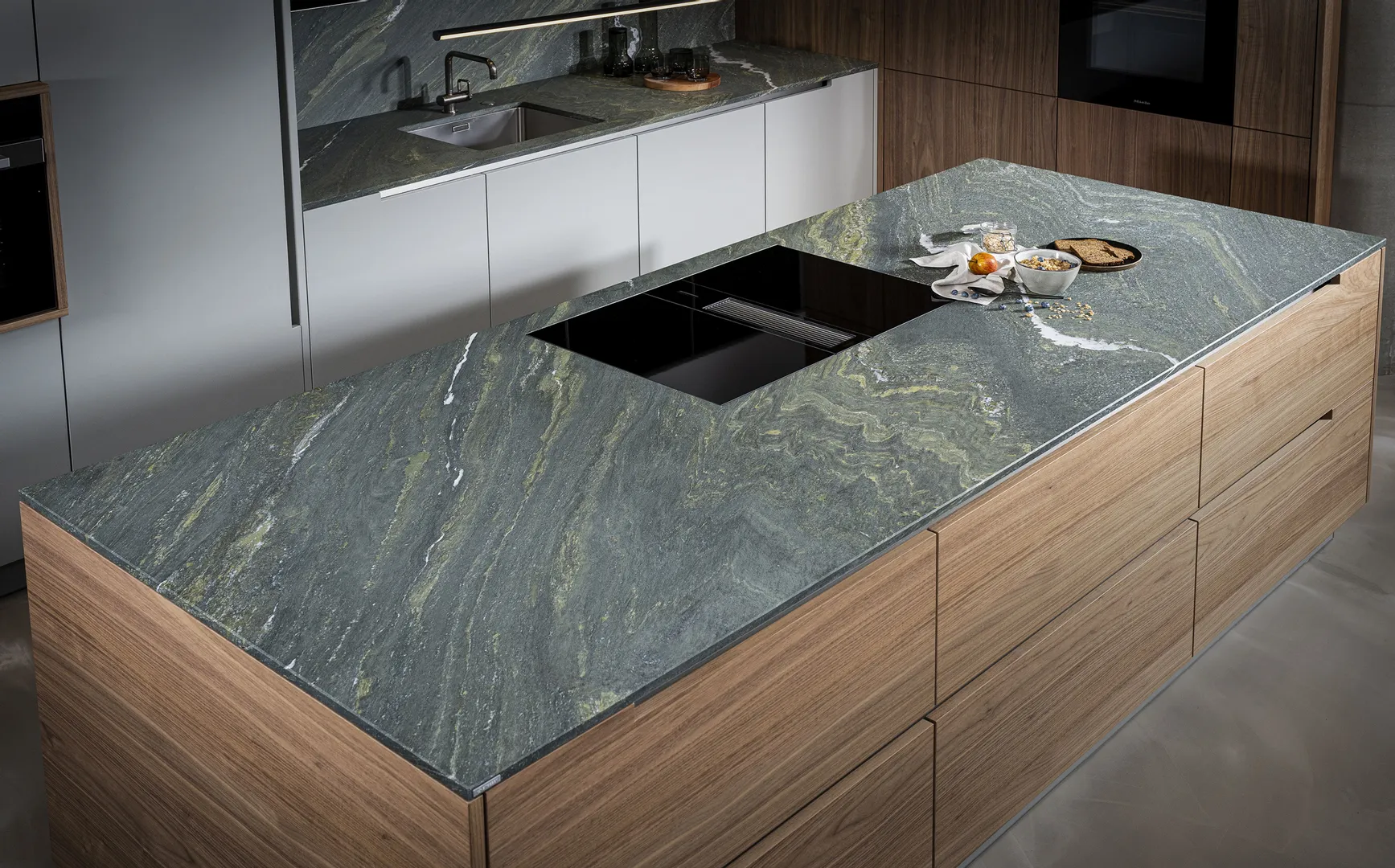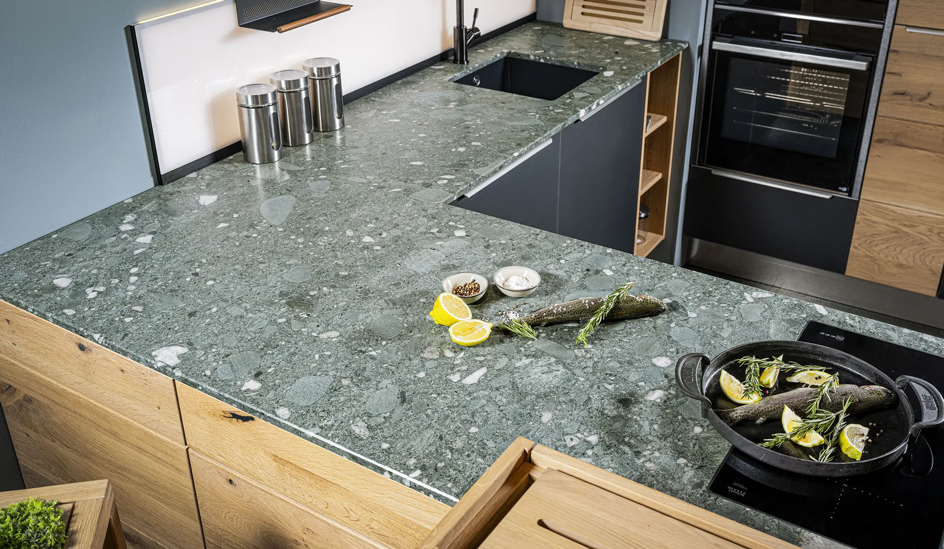 • NEU: In unserem Schauraum in Hallein präsentieren wir seit Kurzem eine neue Ausstellungsküche mit dem Alpengrün. Überzeugen Sie sich selbst, wie elegant dieser heimische Stein auf einer Küche wirkt.