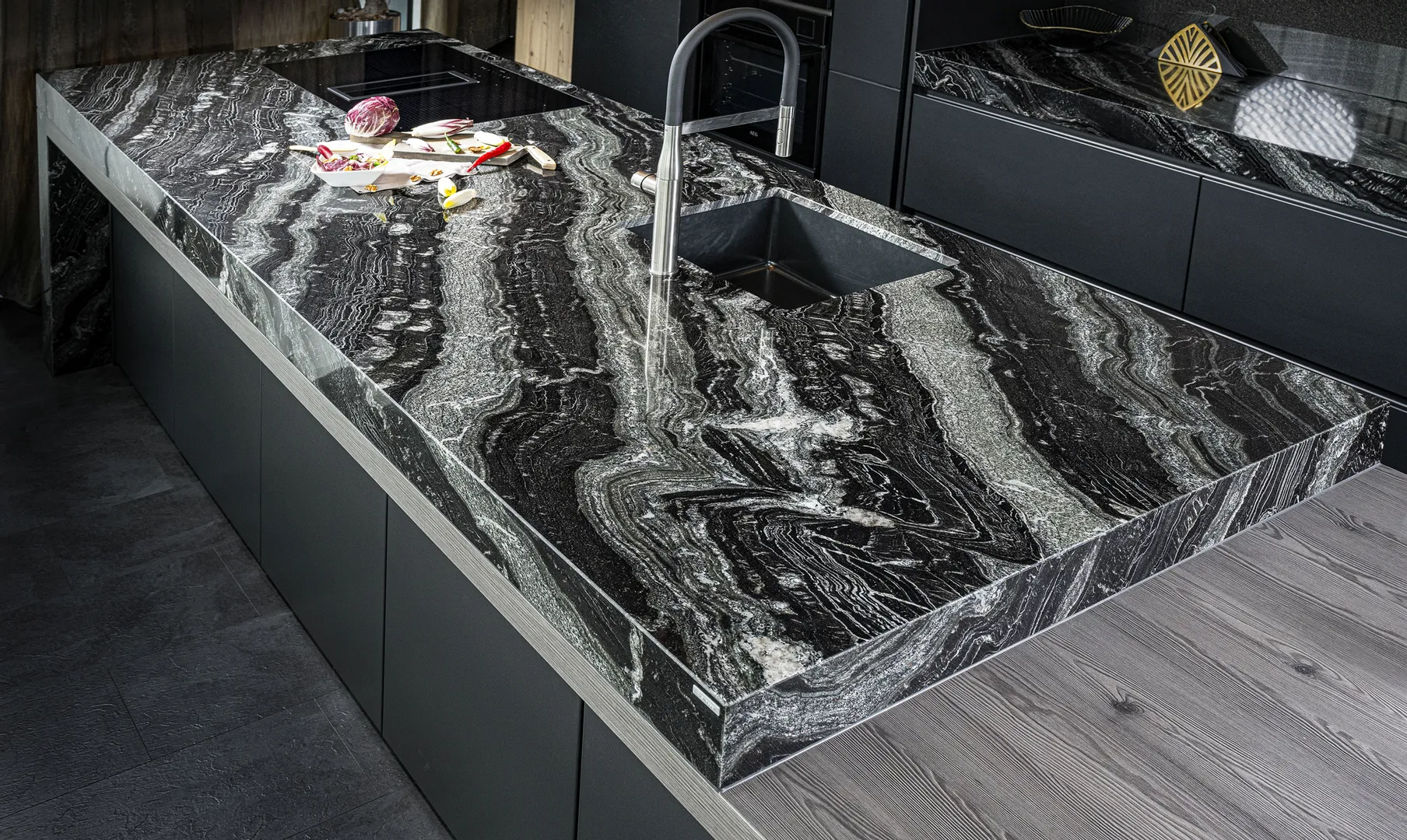 • Ein großer Vorteil gegenüber der Steinarbeitsplatte ist, dass Keramikplatten schon mit einer Stärke ab 12 Millimeter und bis zu 120 Millimeter gefertigt werden können.