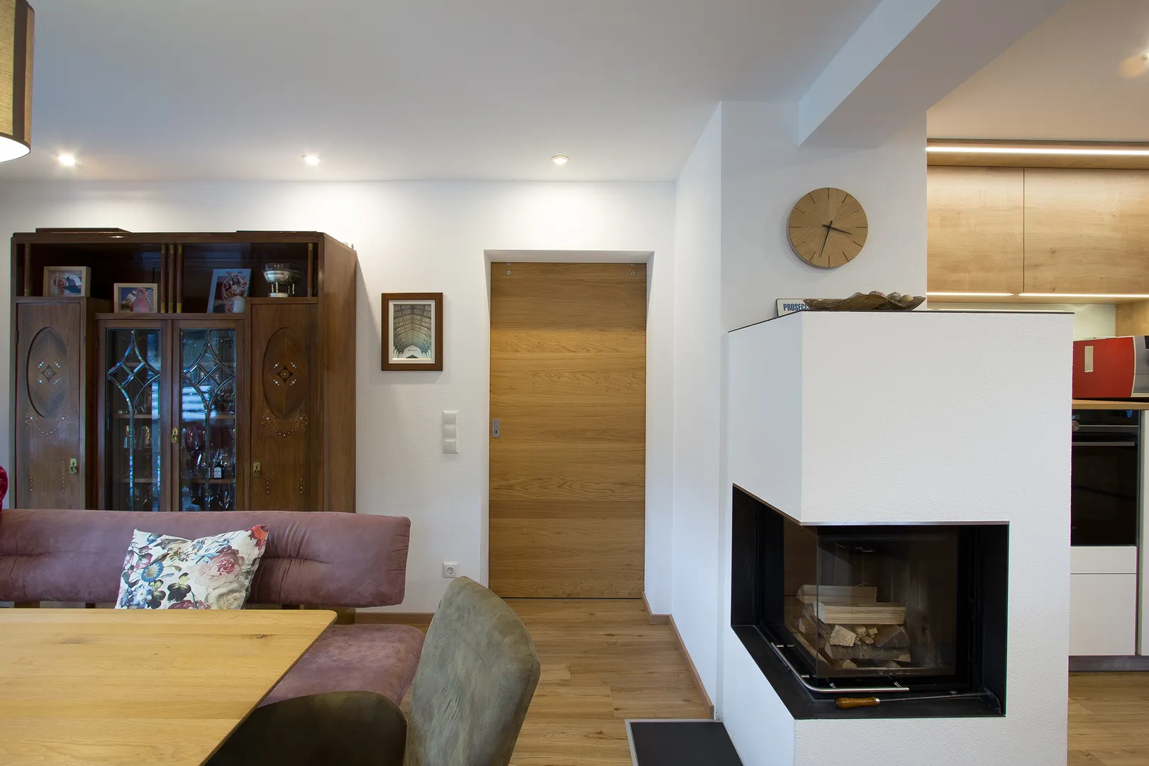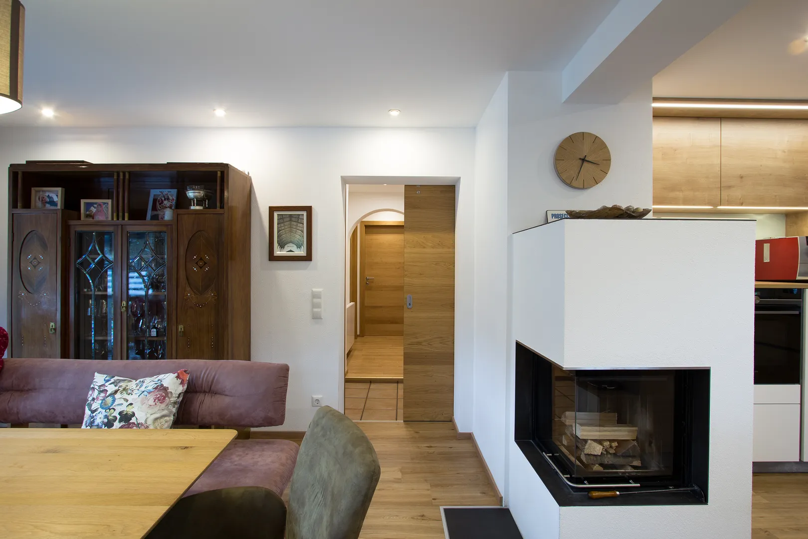 Diese gemütliche Wohnküche haben wir in Gosau eingerichtet. Vorher waren das Esszimmer und das Wohnzimmer getrennt und nur durch eine Türe verbunden. Um Platz für eine große Wohnküche zu schaffen wurden die Wände durchgebrochen und eine große Terrassentüre eingebaut. Aus zwei kleinen Räumen ist ein großer heller Raum mit einem gemütlichen Essplatz entstanden.