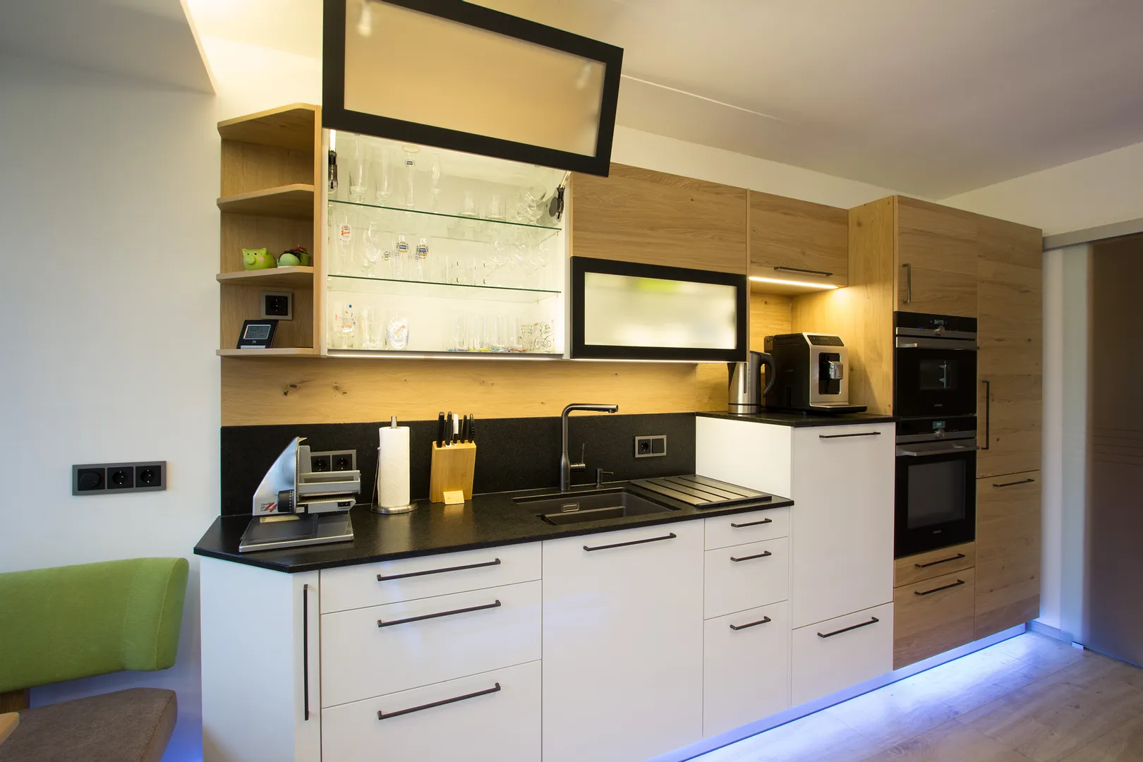 • Moderne Küche mit Holzfronten, schwarzer Arbeitsplatte und LED-Beleuchtung unter Schränken