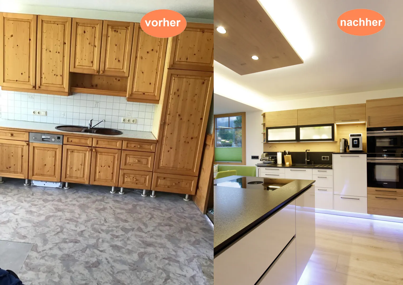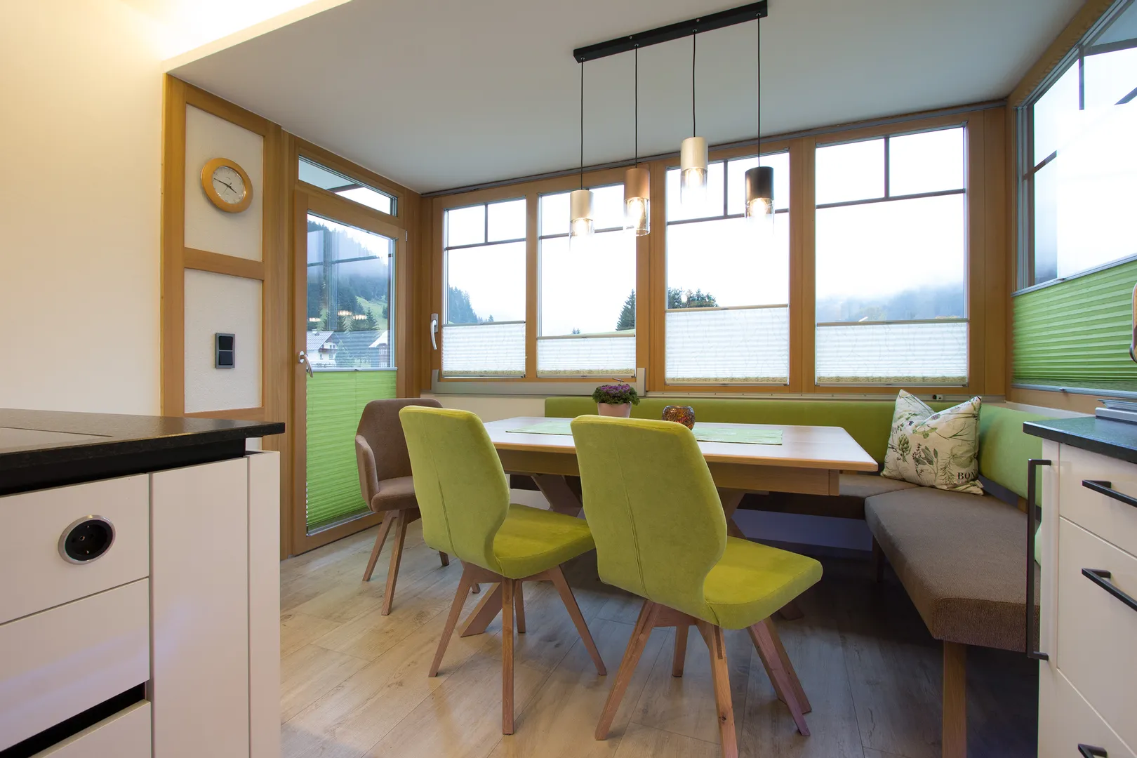 In Gosau haben wir diese gemütliche Wohnküche eingerichtet. Es wurden Wände durchgebrochen und ein Wintergarten gebaut um mehr Platz zu schaffen. Und der ganze Aufwand hat sich wirklich ausgezahlt: Es ist ein heller Raum mit einem gemütlichen Essplatz entstanden.