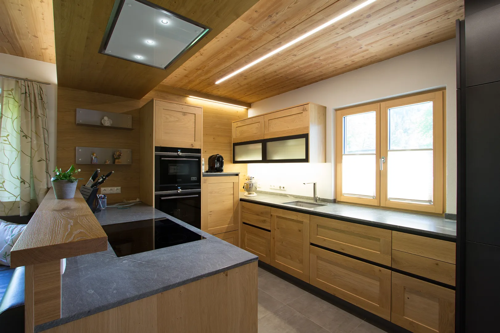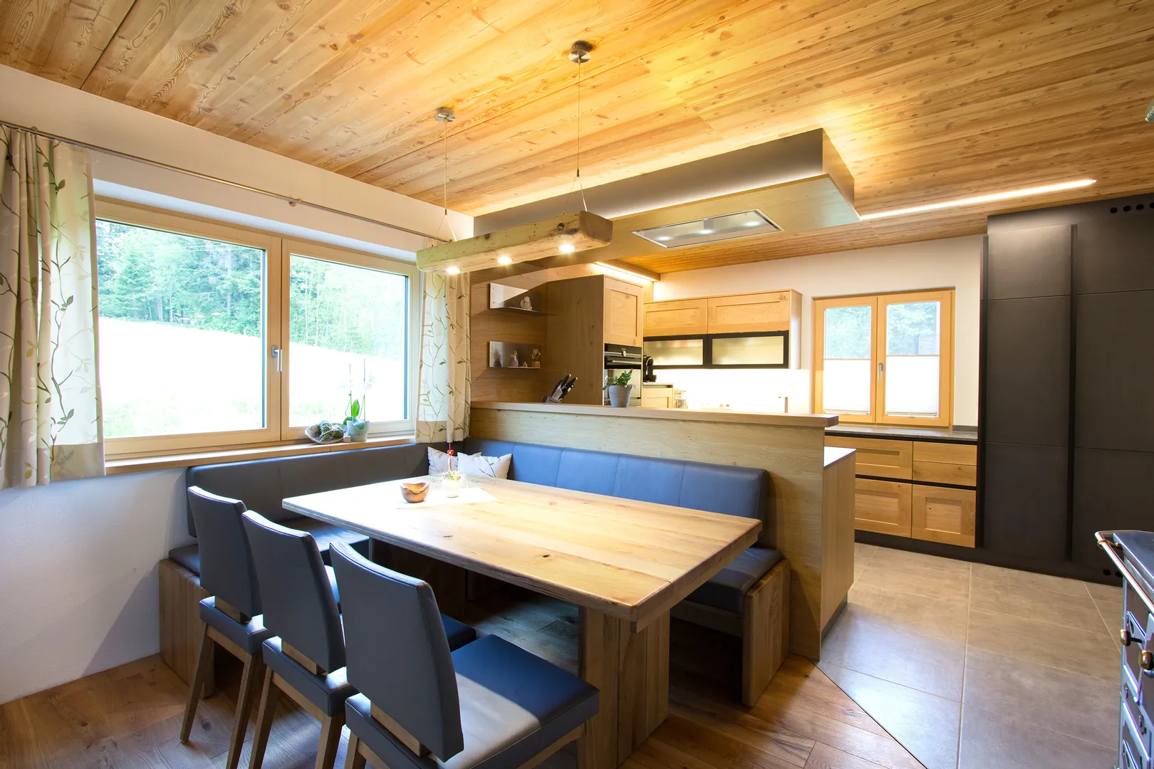 Für eine junge Familie in Rußbach am Pass Gschütt haben wir eine gemütliche Wohnküche geplant, die Holz-Alu-Fenster, Holz-Haustüre und Innentüren in Eiche geliefert.