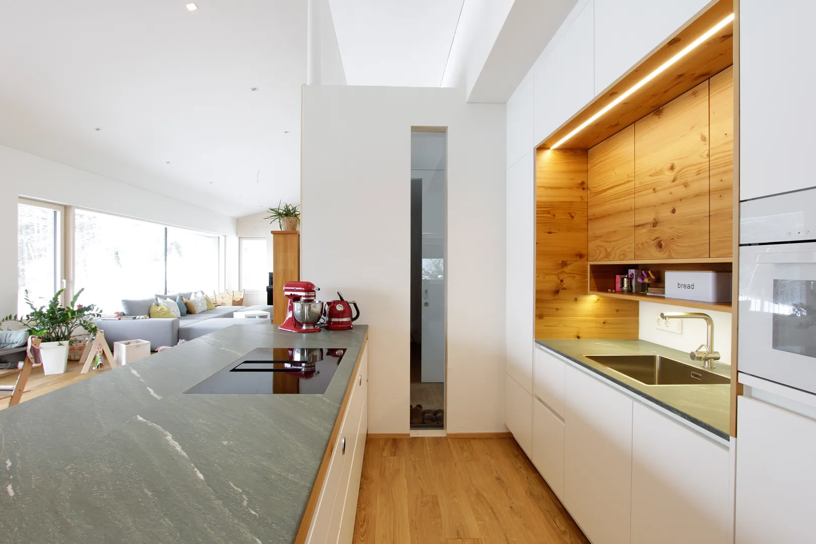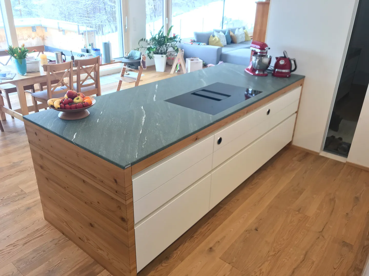 Heimische Materialien liegen auch in der Küche besonders im Trend. In diese moderne Wohnküche haben wir Fichte Altholz und den österreichischen Naturstein "Alpengrün" eingeplant. Der Stein Alpengrün stammt aus Osttirol und wird in der Nähe der Großvenediger-Region abgebaut.
