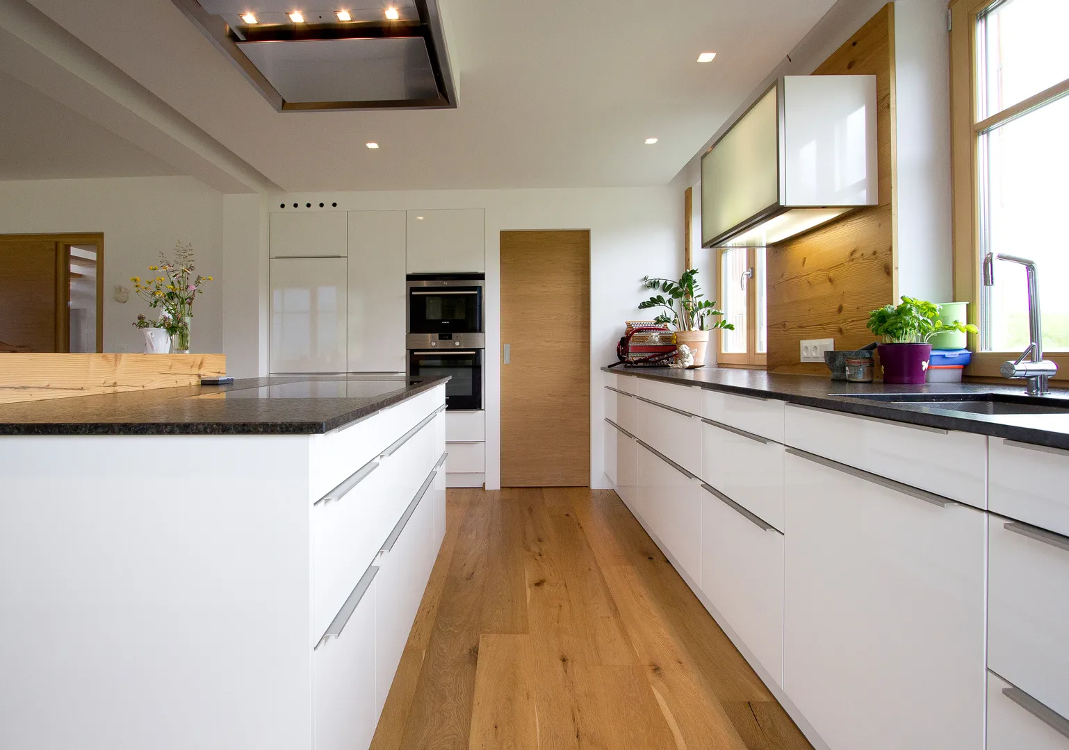 • Moderne helle Küche mit Kochinsel, Holzboden und großen Fenstern