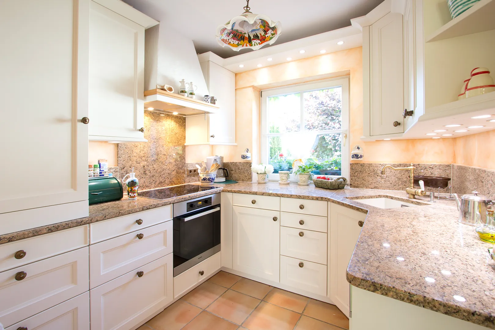 • Helle Landhausküche mit Granit-Arbeitsplatten, weißen Schränken und Blick auf Garten durch Fenster