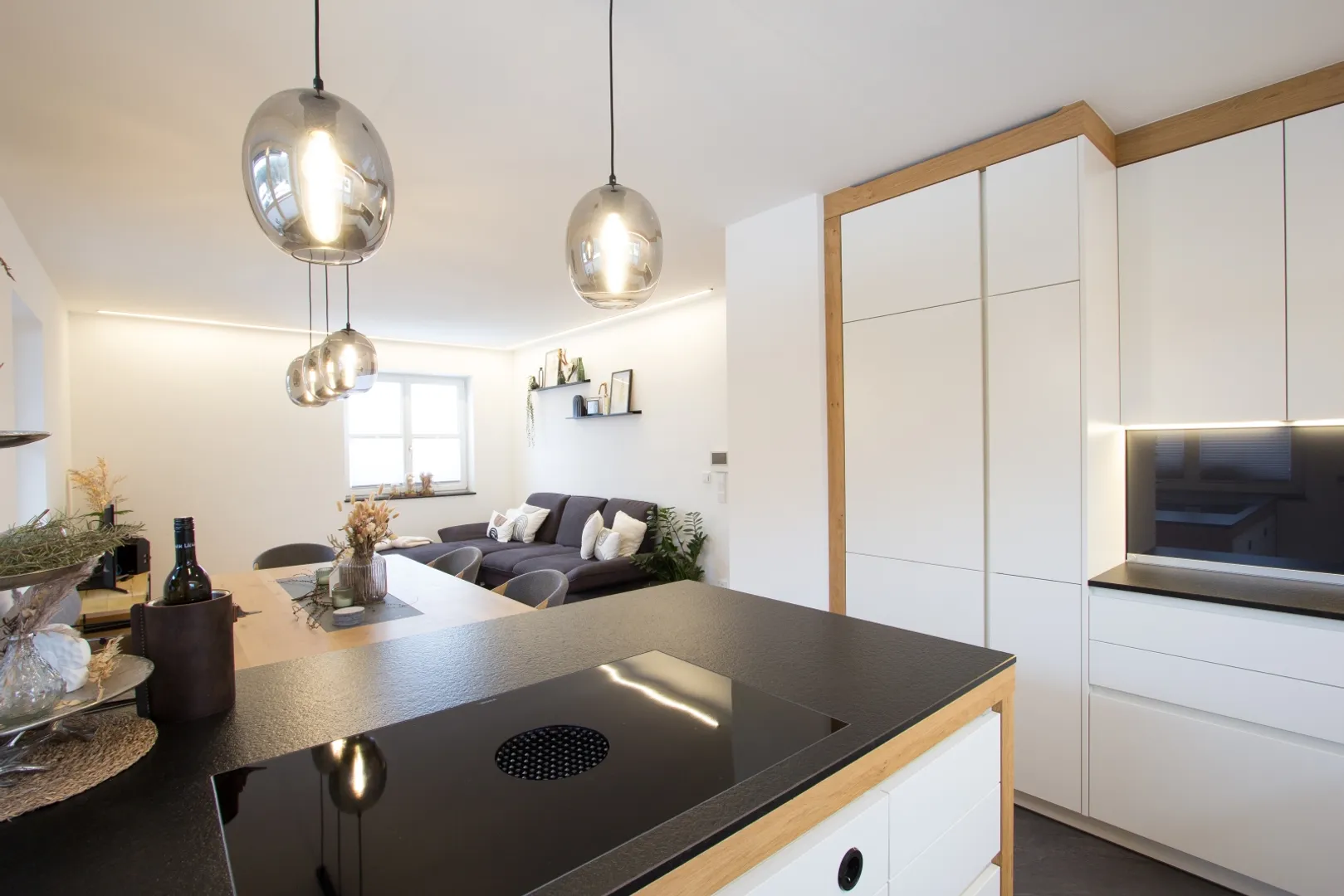 Für eine junge Familie in Abtenau haben wir eine elegante weiße Küche mit Holz eingerichtet. Wo die Küche jetzt ist war vorher ein kleiner Raum. Die Wand wurde durchgebrochen und jetzt wird der große helle Raum als Küche mit Essplatz und als Wohnzimmer genutzt.