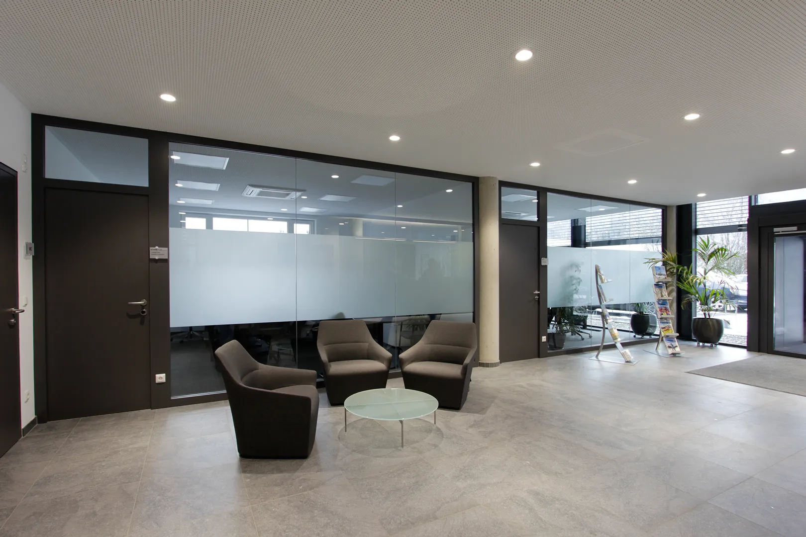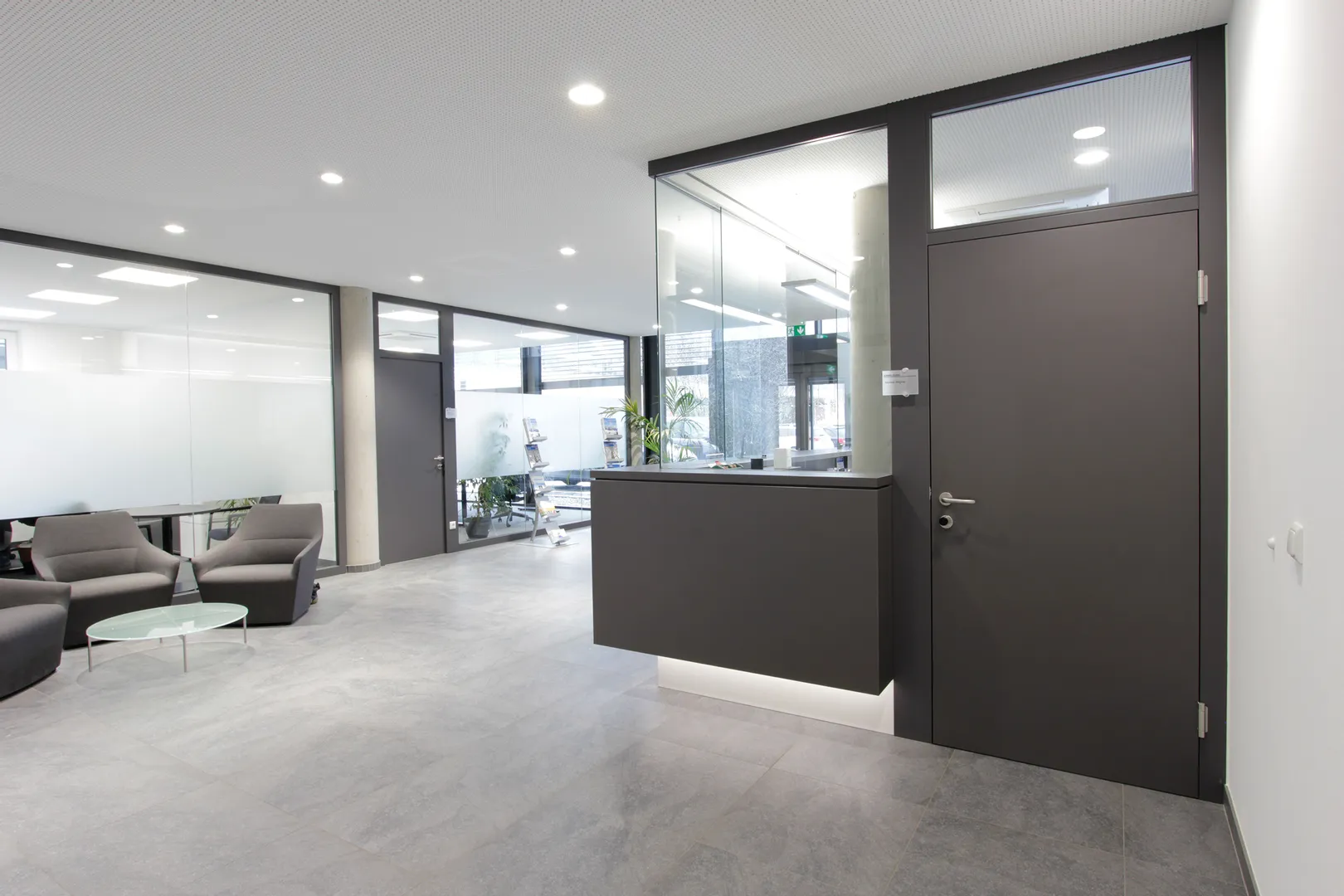 • Moderne Empfangshalle mit schwarzem Tresen, Glaswänden und Prospektständern bei Tageslicht