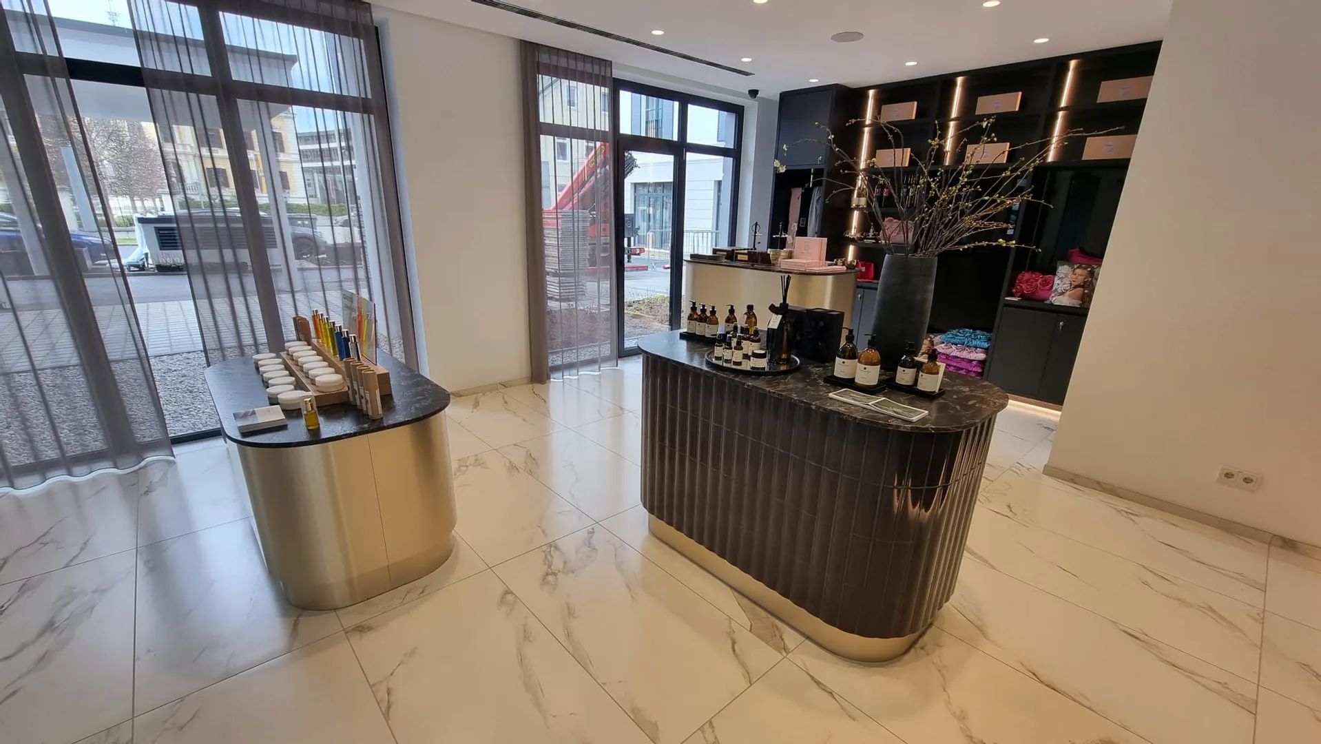 Shop mit abgerundeten Elementen und einer Regalwand