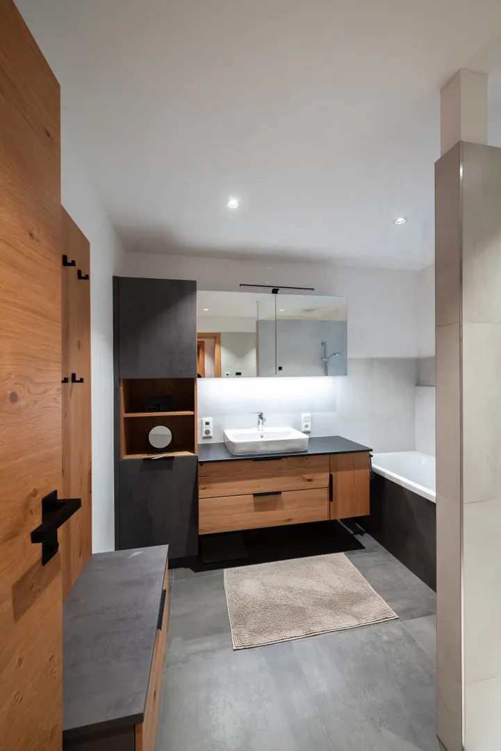 • Modernes Badezimmer mit Holz- und Anthrazitmöbeln, Waschtisch und Badewanne