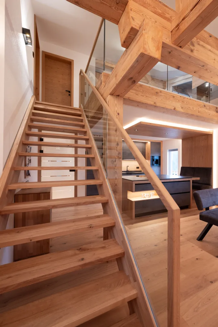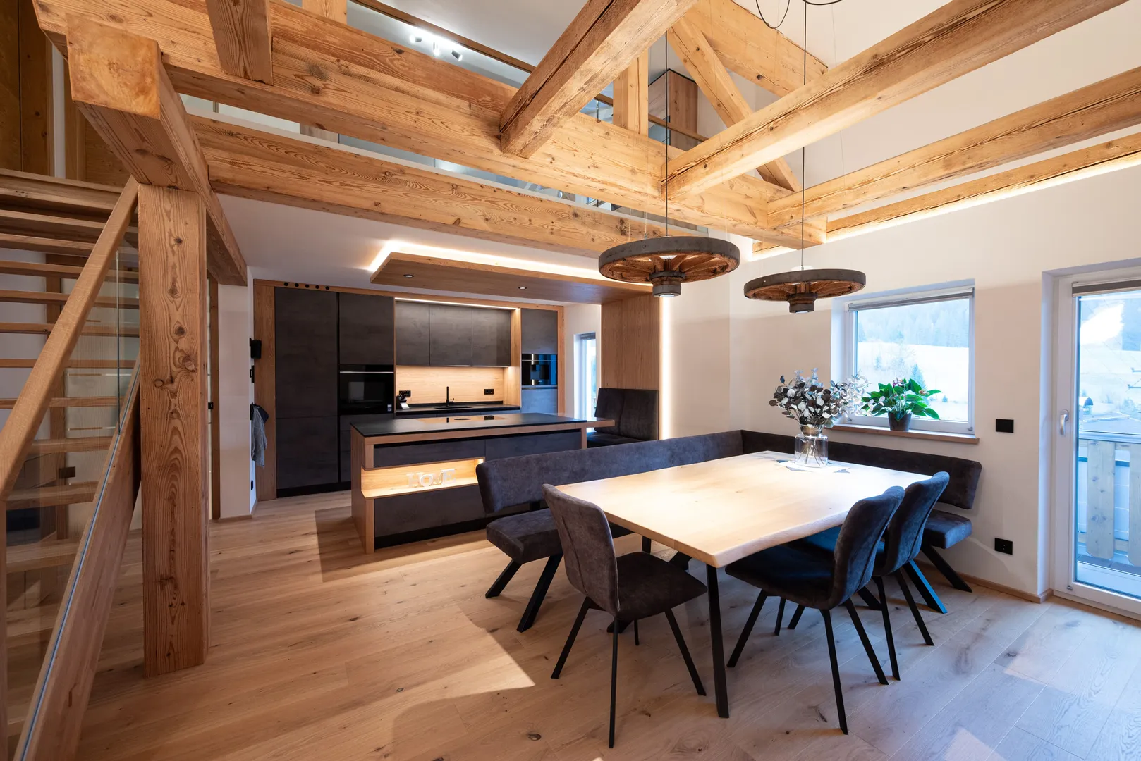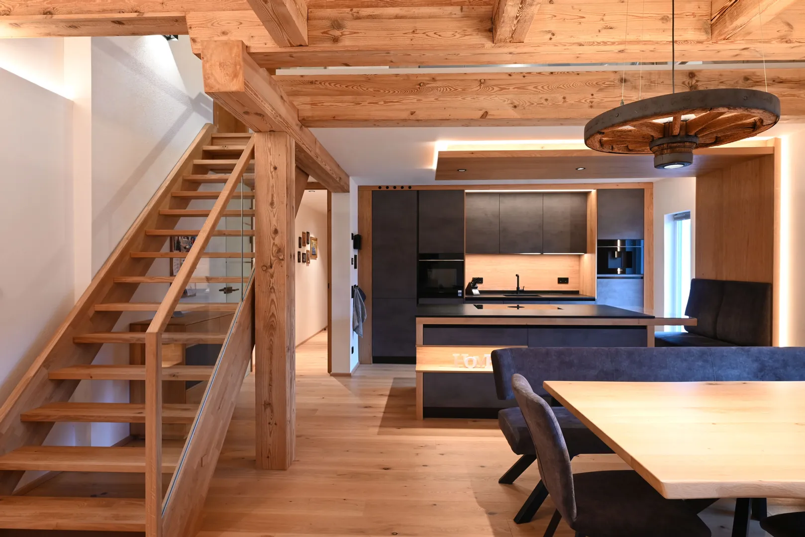 • Moderne Holzküche mit Essbereich, offener Treppe und sichtbaren Deckenbalken