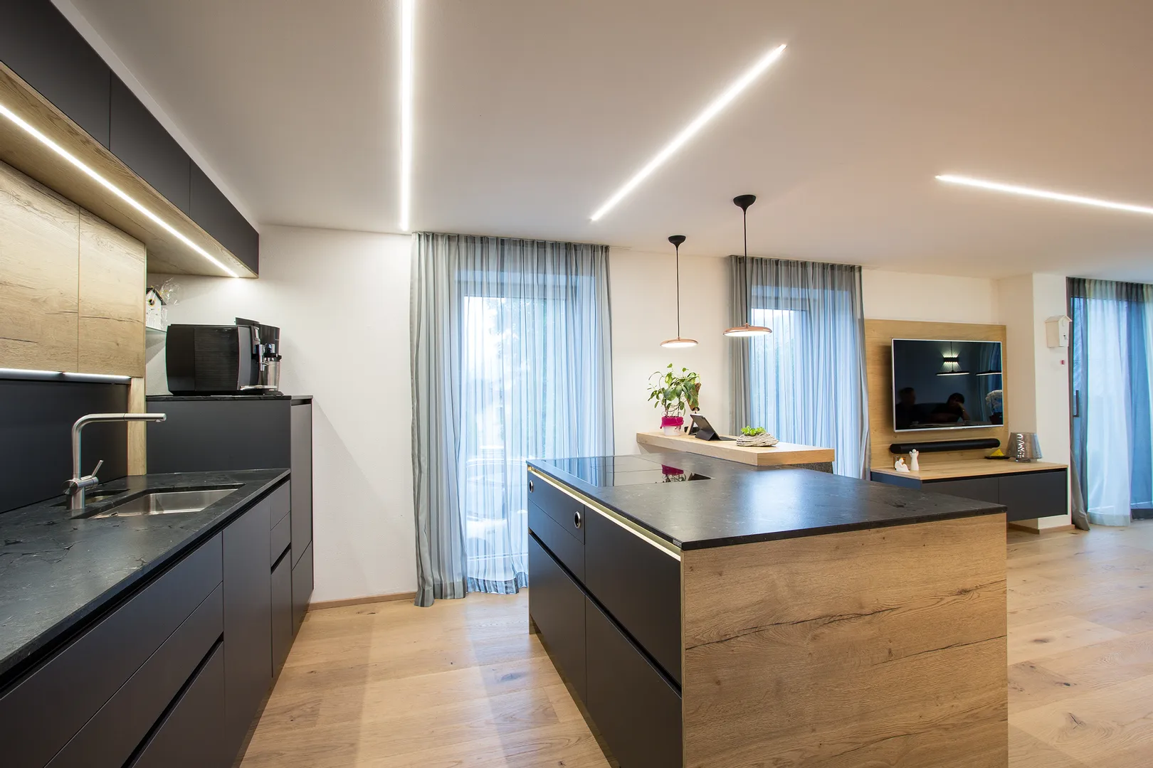 • Moderne Küche mit schwarzen Schränken, Holzdetails und Kücheninsel mit Induktionskochfeld