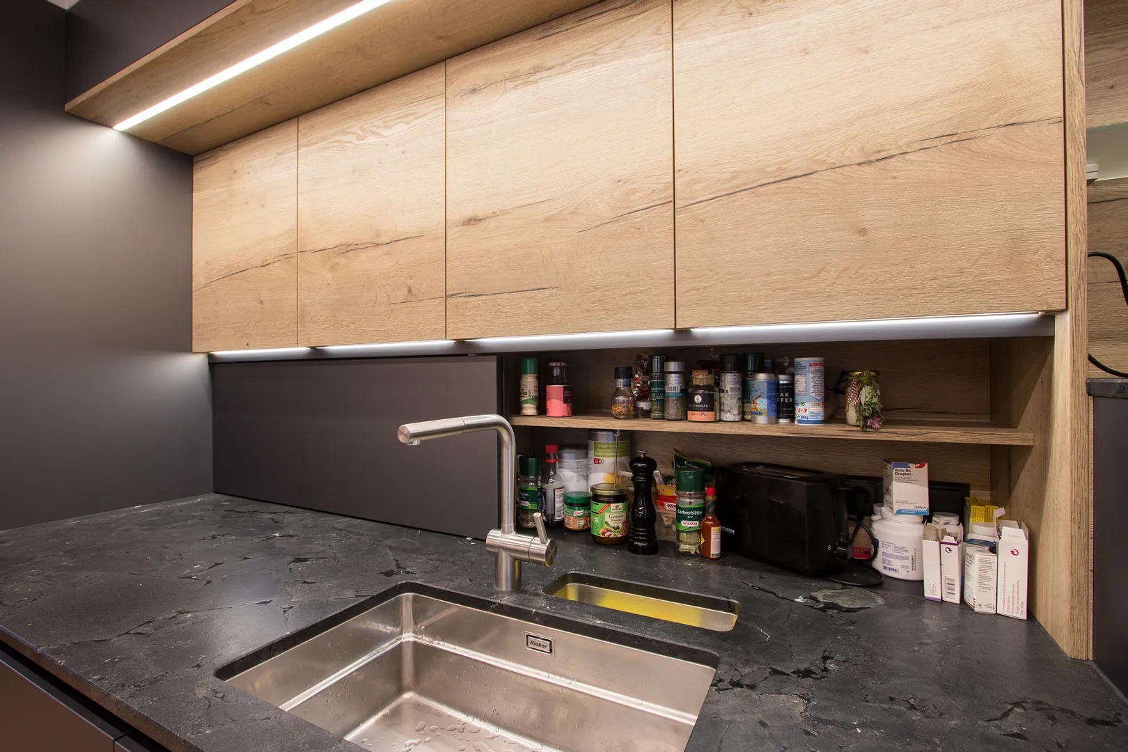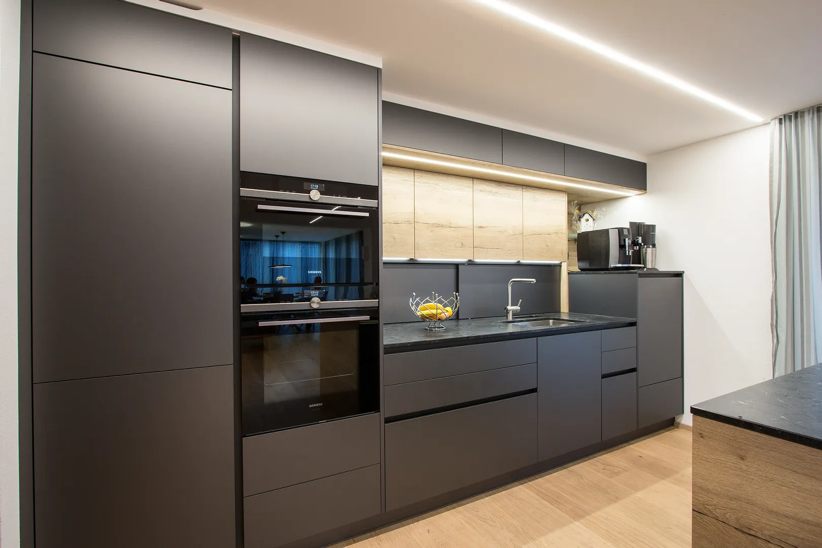 • Die dunklen Küchenfronten wurden mit Eichendekor kombiniert, so wirkt die Küche sehr wohnlich und elegant.