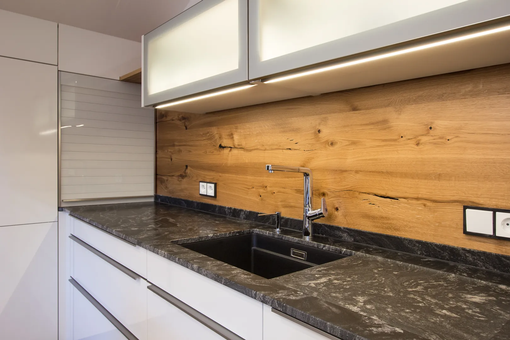 • Moderne Küche mit schwarzer Stein-Arbeitsplatte, Holzrückwand und integriertem Spülbecken