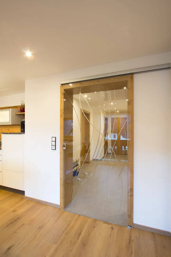 • Die satinierte Schiebetüre im Wohnzimmer und die Glasschiebetüre in der Küche wirken sehr elegant.
