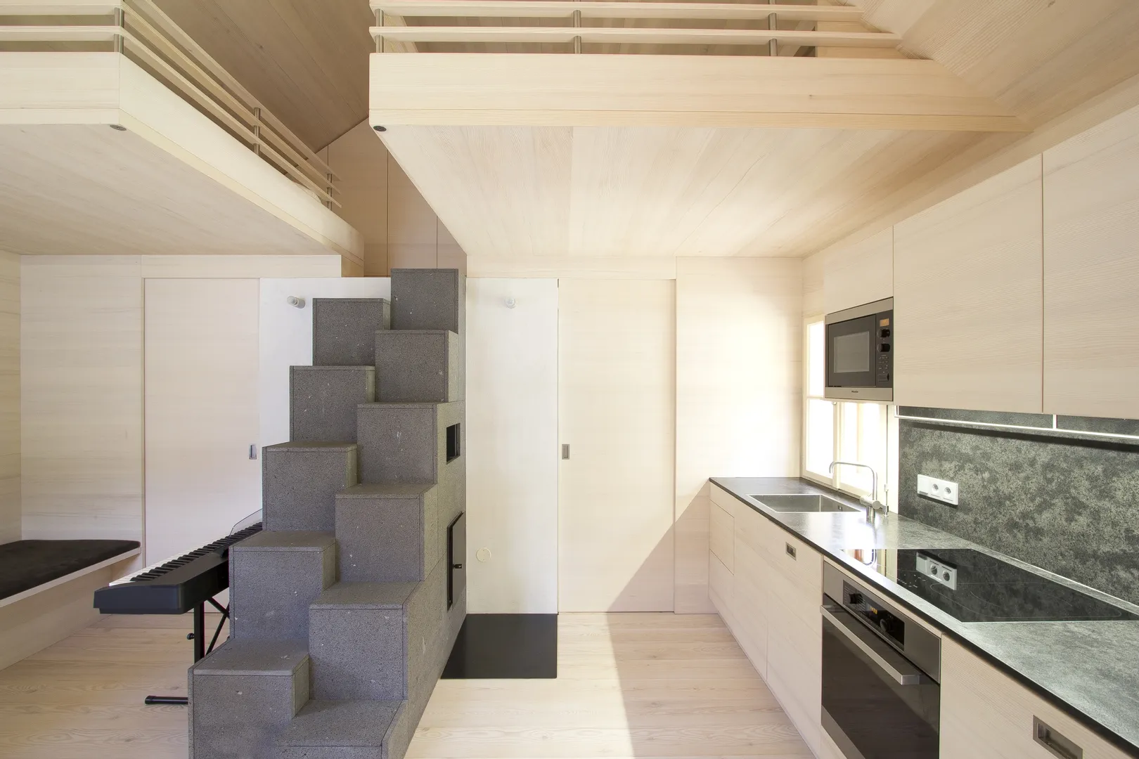 • Helles minimalistisches Wohnzimmer mit Holzverkleidung, Esstisch, modernen Stühlen und grauem Treppenofen