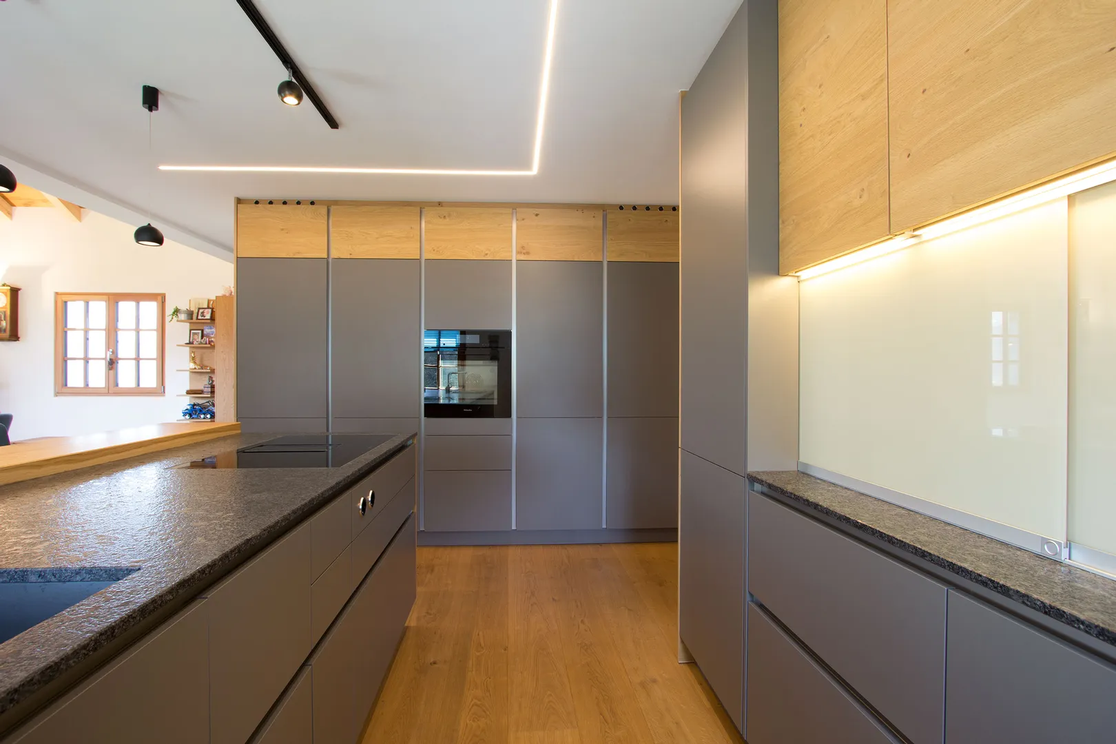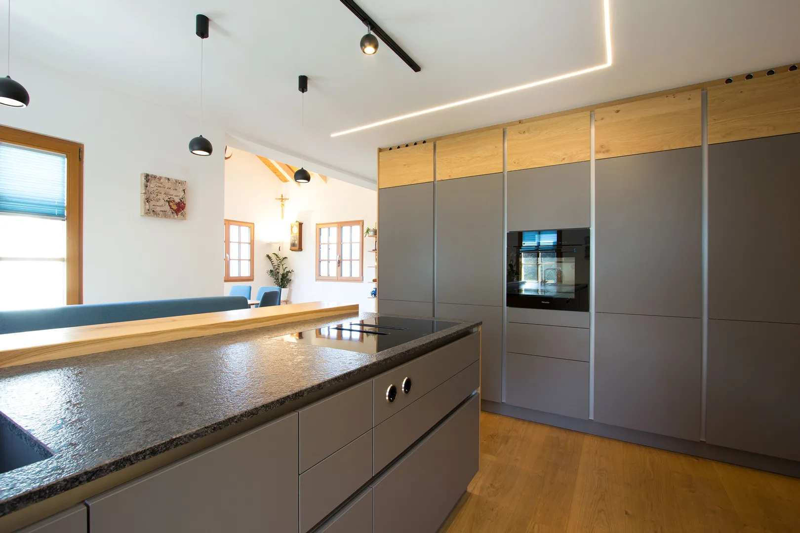 • Die Küchenfronten sind in Grau und Eichenholz kombiniert, dadurch wirkt die Küche nicht nur sehr gemütlich sondern auch modern und zeitlos elegant.