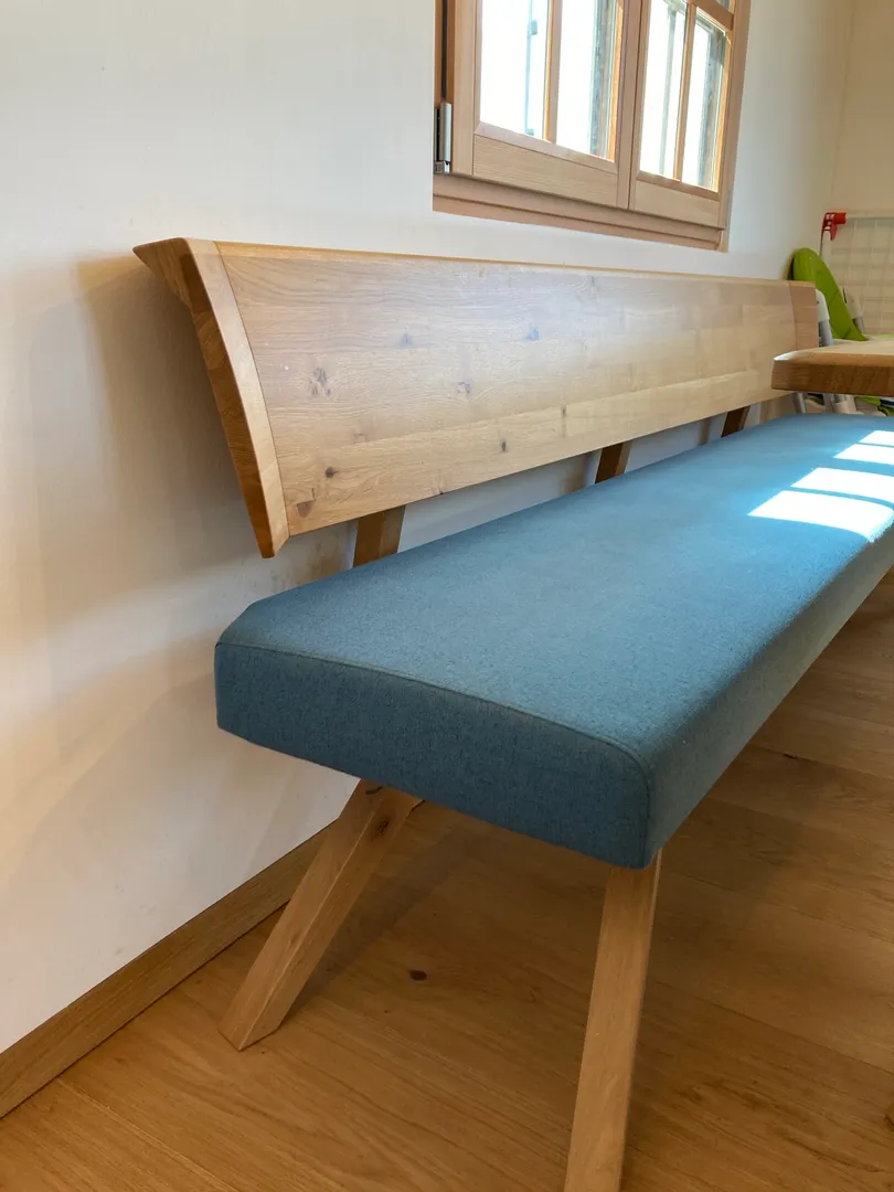 • Die Sitzbank und die Stühle von unserem Lieferanten Schösswender sind in einem modernen Petrol gepolstert.