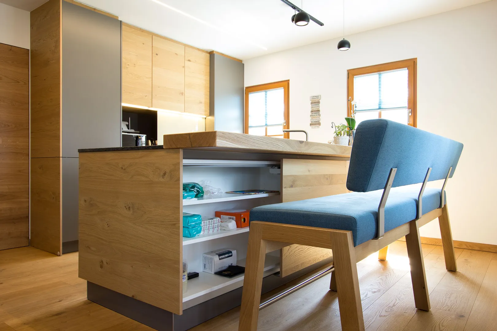 • Ideal, wenn auf einer Inselseite zu wenig Platz für Drehtüren ist, zB wegen einer Mauer oder wie in dieser Küche wegen der Sitzbank.