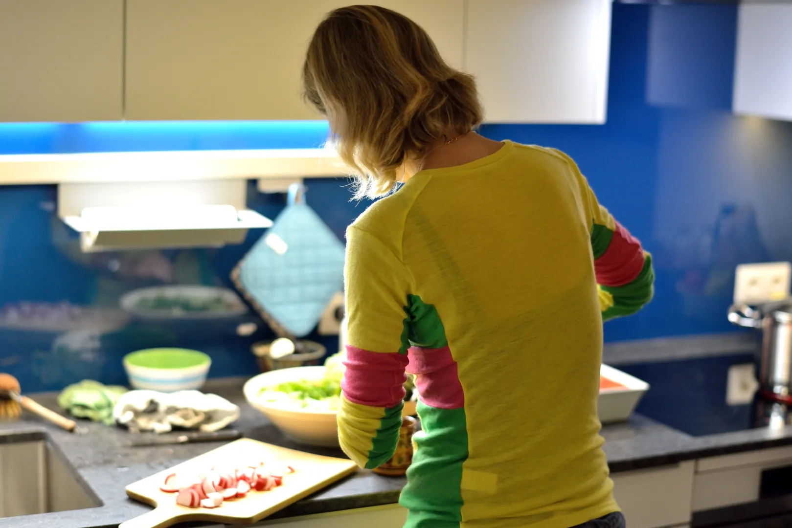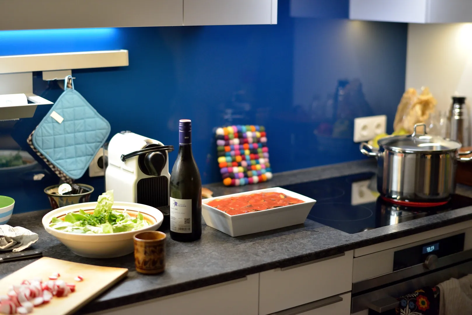 • Kücheneinrichtung einer kleinen Küchenzeile mit blauer Glasrückwand