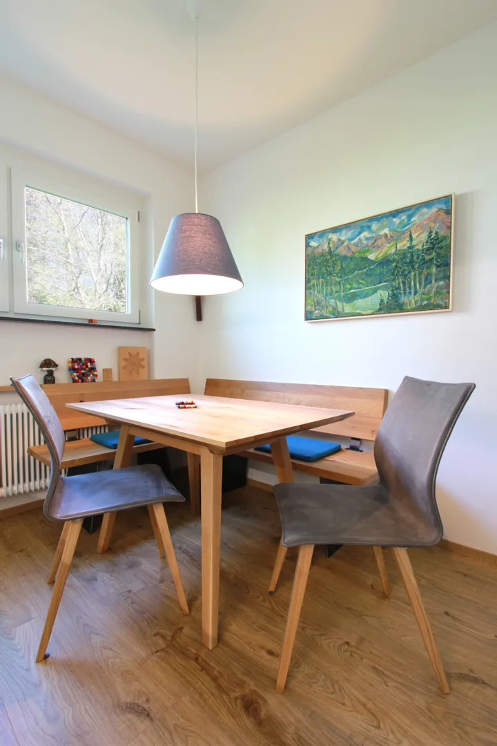 Einrichtung Wohnung in Salzburg mit Zirbenbett, Küche und Esszimmer