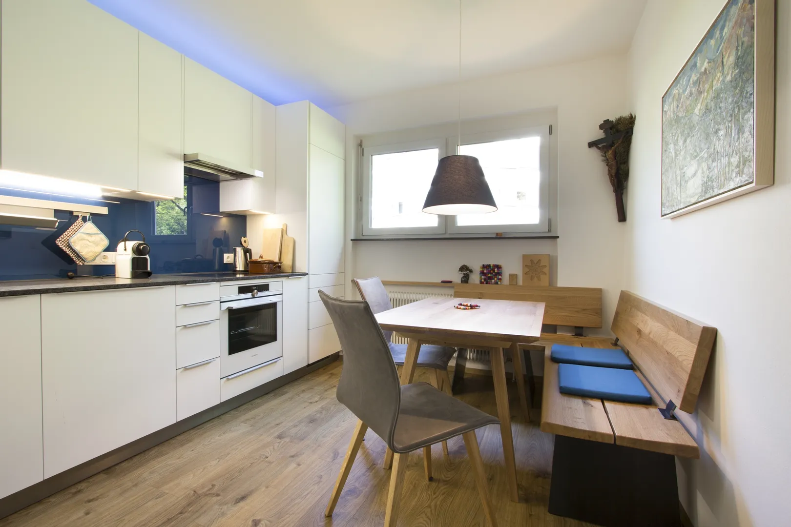 • Moderne Küche mit Essbereich, Holzbank und blauen Akzenten auf hellem Holzboden