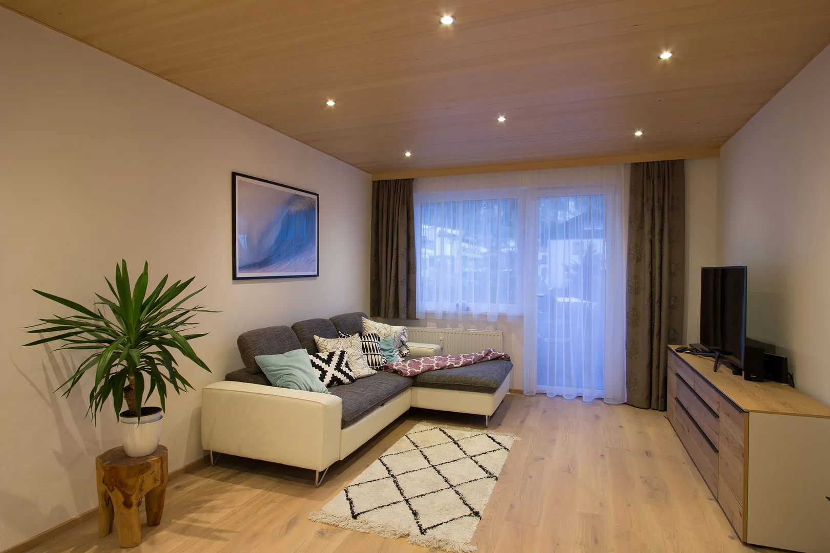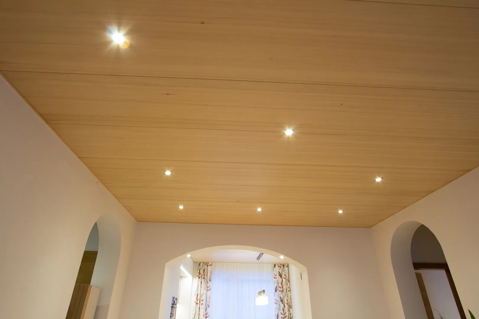 • Die Decke haben wir in Tanne gestaltet. Nicht nur optisch ein Highlight sonder in dieser Altbauwohnung auch als Wärmedämmung ideal. Mit den Spots wirken die Räume außerdem elegant und gemütlich.