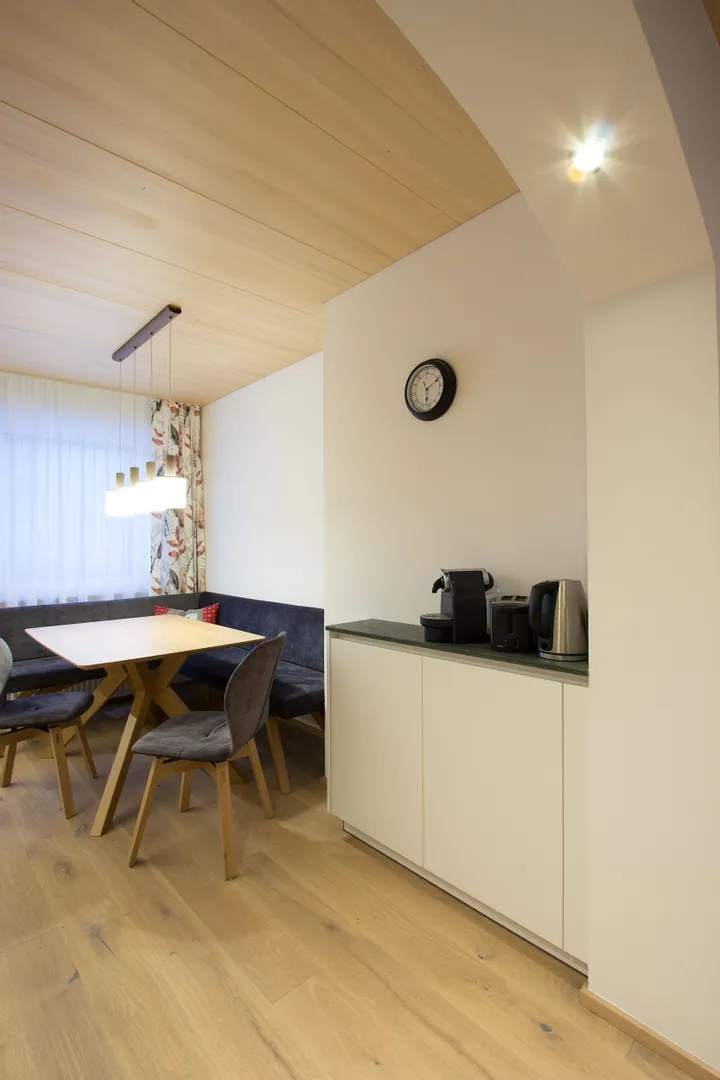 • Die Decke in Weißtanne haben wir nach Maß in unserer Tischlerei gefertigt und in der Küche und im Wohnzimmer durchgezogen, dadurch wirkt die kleine Wohnung elegant und gemütlich.