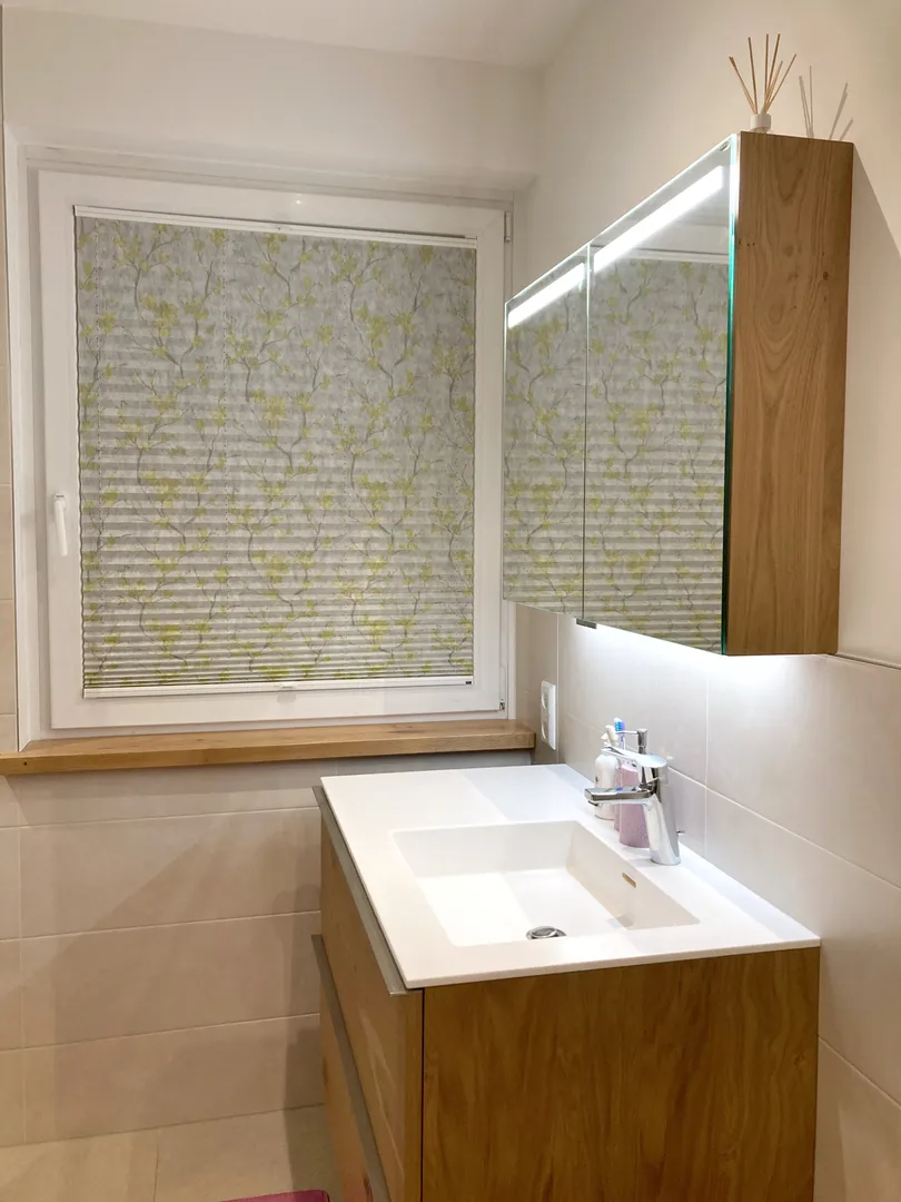 • das neue Plissee der Marke Leha ist feuchtigkeitsbeständig und die hellgrünen Kirschblüten lockern das Badezimmer auf