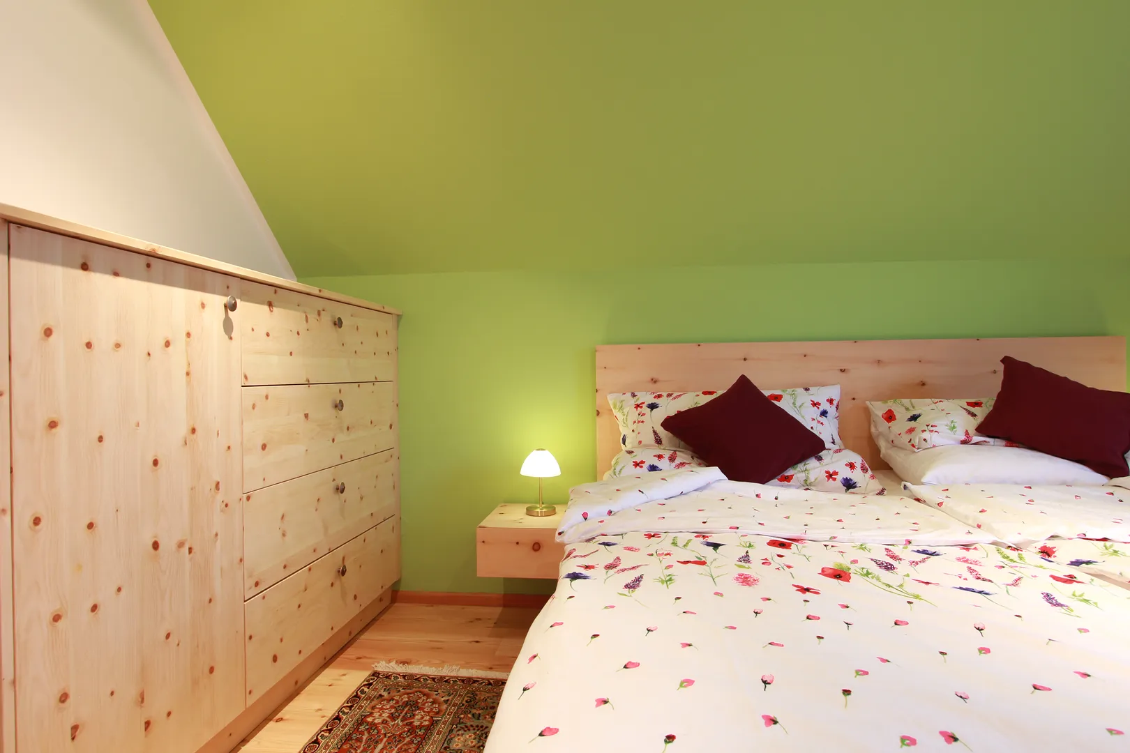 Zirbenschlafzimmer mit Zirbenbett und Zirbenkommode