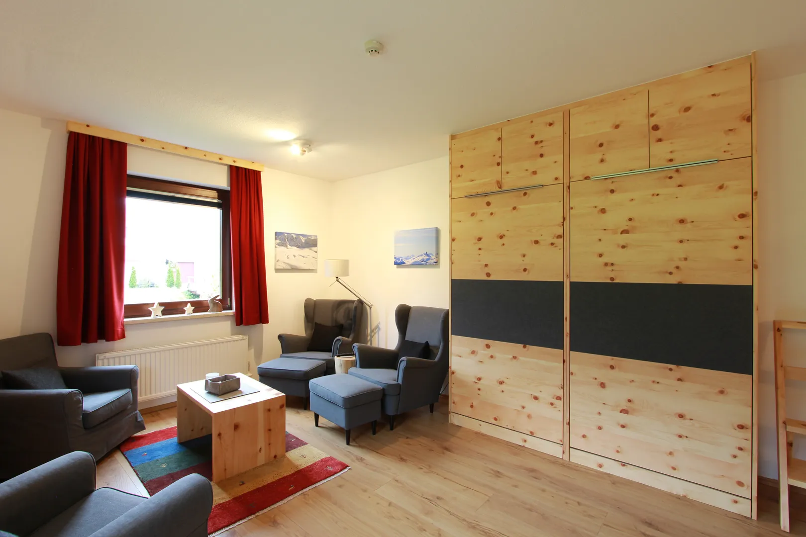 • Für das Wohnzimmer haben wir einen Zirbenschrank gefertigt, der Platz für zwei Klapp-Betten bietet