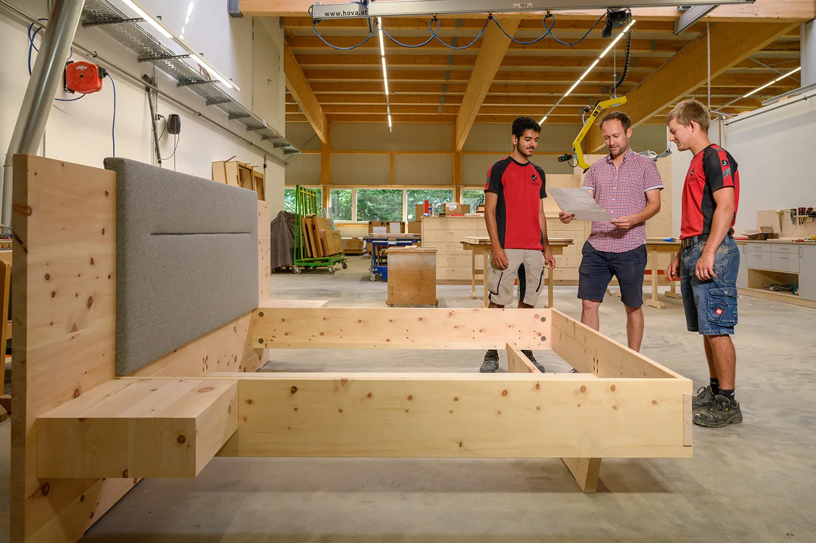 • Unmontiertes Massivholzbett mit Kopfteil und Nachttisch in einer Schreinerei