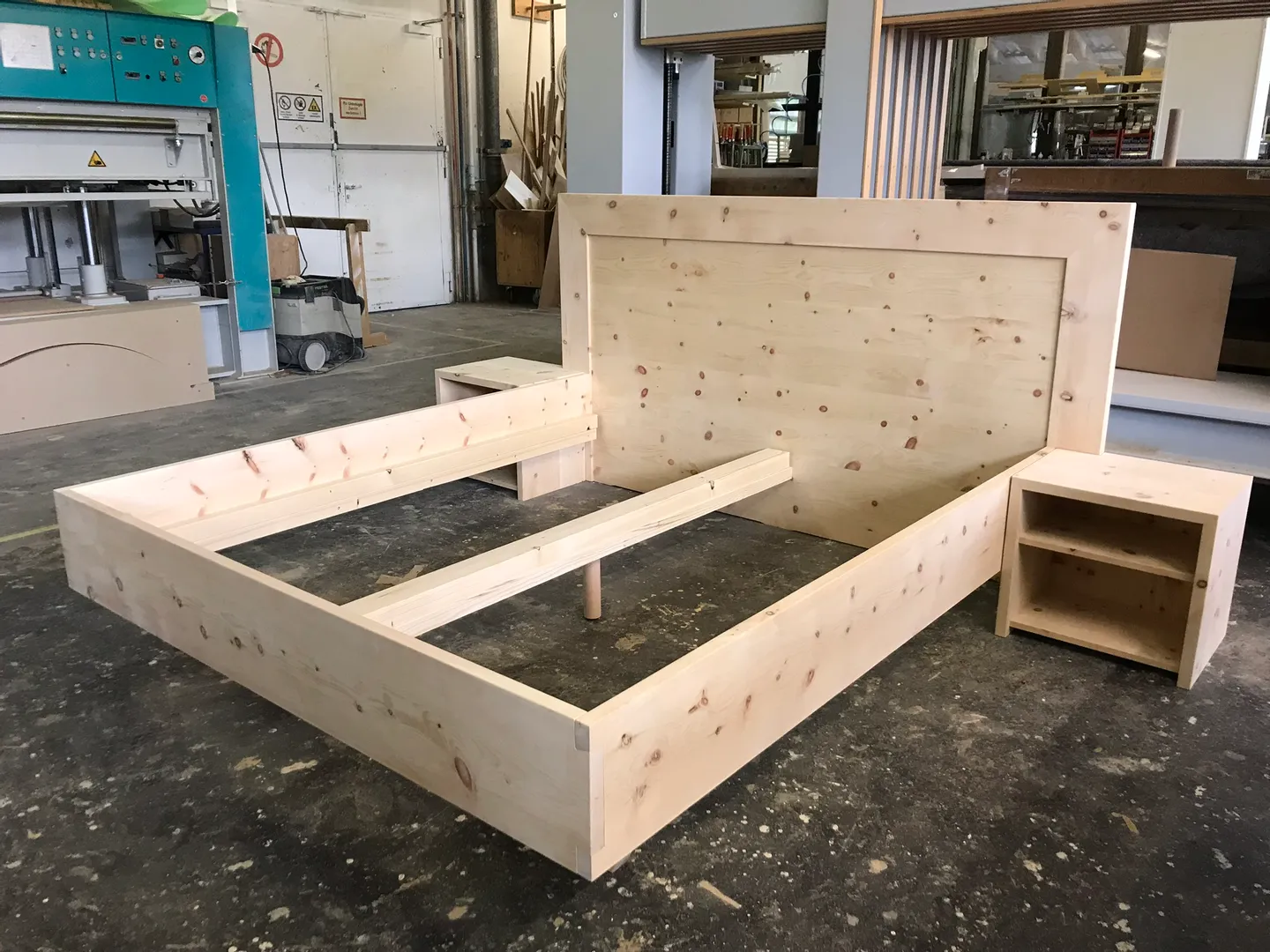 • Als nächstes wird das Zirbenbett von unseren Tischlern aufgebaut, dabei werden die Seitenteile und das Kopfteil miteinander verbunden und montiert